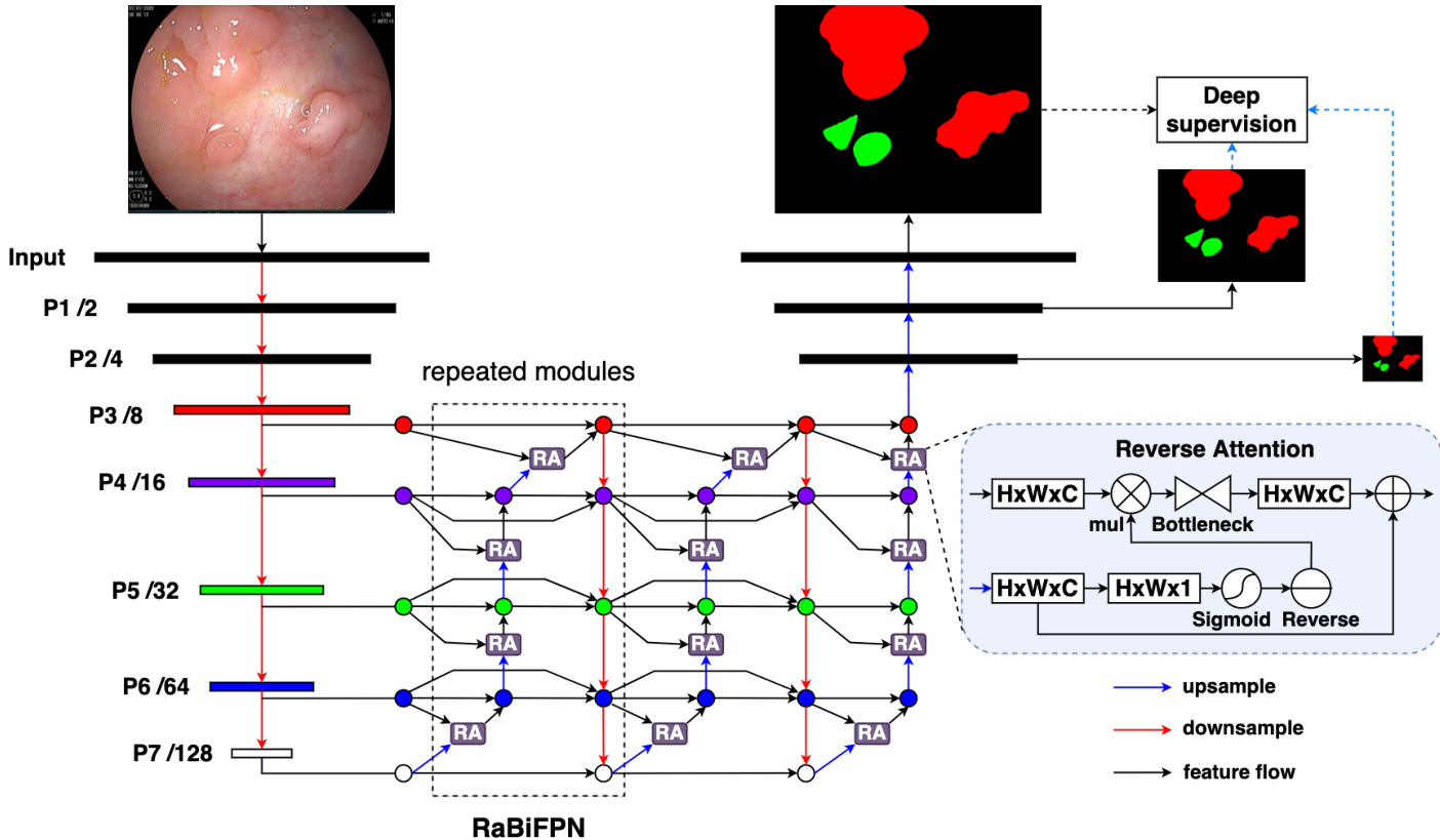 - 提出了一种使用瓶颈层的轻量级二元RA模块,该模块可在双向特征金字塔层堆叠中多次重复,以逐步细化息肉分割边界;