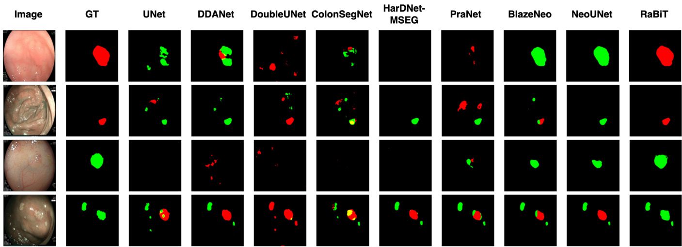 Table 2 shows the performance comparison of SOTA methods on three-class polyp segmentation datasets. RaBiT outperforms the second-best method, NeoUNet [13], for every metric by a large margin of about $3%.6%$ . Fig. 7 shows the qualitative comparison between our approach and other SOTA methods on the NeoPolyp-Large dataset. One can see that RaBiT yields better segmentation results than other SOTA methods in many challenging cases.
