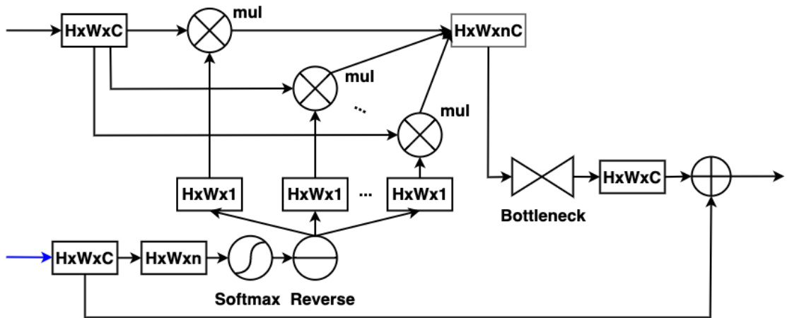 For binary segmentation, we use a $3\mathrm{x}3$ conv layer with one neuron to compress the input feature map to a single channel. We then apply a sigmoid function followed by a reverse operation to perform RA for a single polyp class (see Fig. 1). For multi-class segmentation, we use a 3x3 conv layer with $n$ neurons to compress the input feature map to $n$ channels, where $n$ is the number of classes. We then apply a softmax function to generate an attention map for each channel. Next, each attention map is reversed to produce a reverse attention map and element-wise multiplied with the input feature map. Finally, the resulting feature maps are concatenated to form a $H\times W\times n C$ volume (see Fig. 2). To avoid parameter explosion when repeating the RA module multiple times in the network, we propose using a bottleneck module when performing the convolution operation to obtain the output feature map of the RA module. The bottleneck module consists of a 1x1 conv layer with $C/2$ neurons, followed by a 3x3 conv layer with $C/2$ neurons, and ends with a 1x1 conv layer with $C$ neurons.