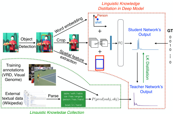 Figure 1. Linguistic Knowledge Distillation Framework. We extract linguistic knowledge from training annotations and a public text corpus (green box), then construct a teacher network to distill the knowledge into an end-to-end deep neural network (student) that predicts visual relationships from visual and semantic representations (red box). GT is the ground truth label and   $\mho$   is the concatenation operator.