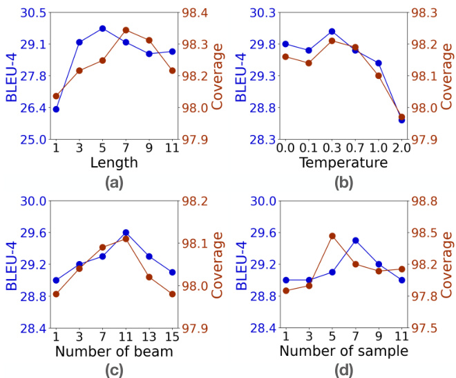 Figure 2: Performance (y-axis) of supervised GPT-2 in terms of BLEU-4 and Coverage with varying lookahead parameters ( $\mathbf{\check{X}}$ -axis) on COMMONGEN validationset.