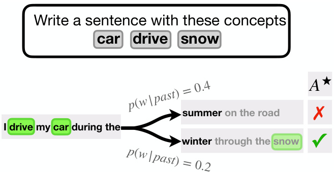给定一组概念(例如 {投掷, 跑步, 标枪, 跑道}),任务是生成一个连贯的句子,描述一个使用所有给定概念的合理场景(例如“一名男子在跑道上跑步并投掷标枪。”)。