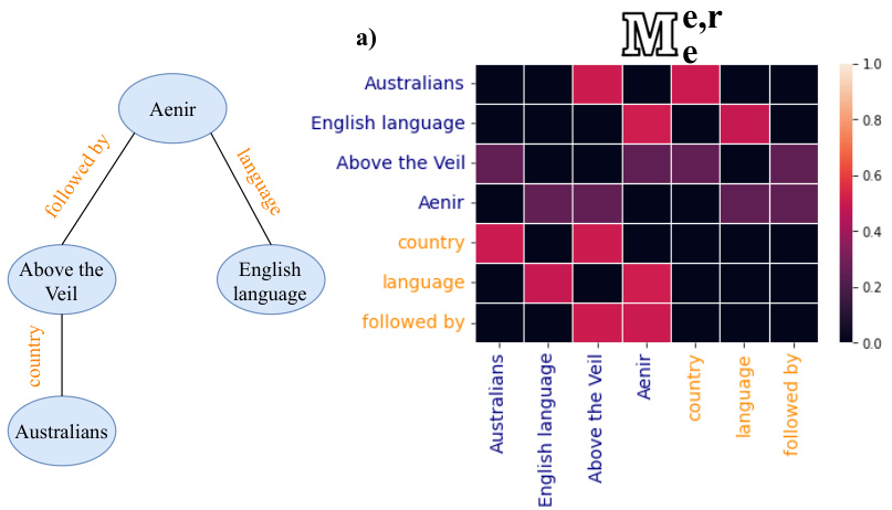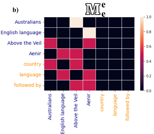 In Figure 4 we show an example KG representing Aenir, an Australian fantasy novel, with its relations (orange) and entities (blue) along with the attention heatmaps and outputs from two of our framework decisions. The left (a) heatmap and output corresponds to our best performing model without type encoding, $M_{e}^{e,r}$ , while the right (b) corresponds to $M_{e}^{e}$ . We choose these two mask