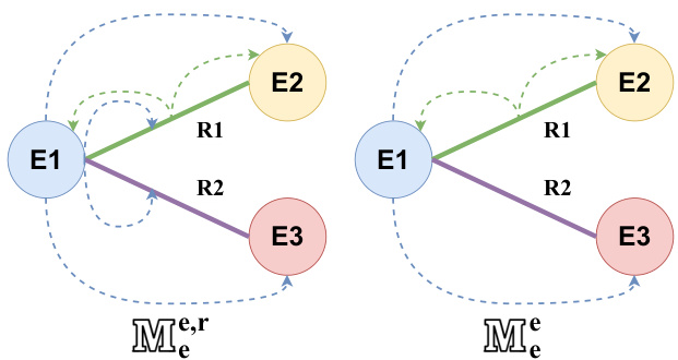 即,在选择关系应关注哪些组件时。为便于参考和讨论,上标表示实体的邻域类型,下标表示关系的邻域类型,例如 $M_{e,r}^{e,r}$。举例来说,当实体关注相邻实体和关系,但关系仅关注实体时,我们用 $M_{e}^{e,r}$ 表示掩码矩阵。图 3 通过一个图及其关注组件展示了两个这样的矩阵。