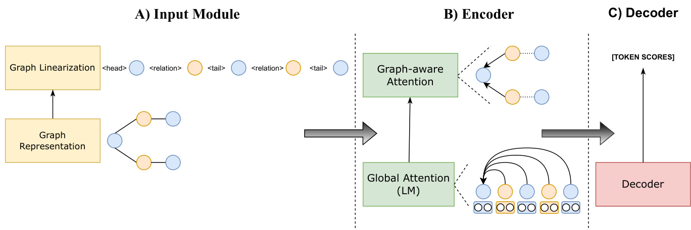 Figure 2: Overview of the Graph-aware framework for graph-to-text generation. Given a KG, we first transform the graph into its appropriate representation before linear i zing the graph. Next, each node of the KG is encoded via a global attention, followed by a graph-aware attention, ultimately being decoded into a sequence of tokens.