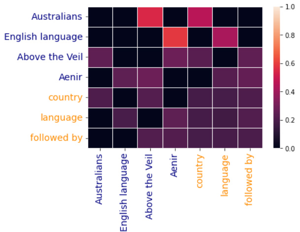 Output: Above the Veil was the sequel to Aenir which is written in English and was published in Australia. Figure 5: An additional case study of the graph attention weights for model $M_{e,r}^{e,r}$ with type encoding.