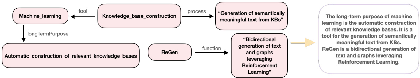 Figure 1: Actual examples of generation for Text-to-Graph and Graph-to-Text tasks using our best RL models. The first two sentences of the abstract were processed through our best models. First, a graph was created capturing the facts from the input sentences. Then, this graph was used as input to generate text. Despite a strong domain mismatch between input data and models, the generated paragraph is capturing most of the original sentences content. Both models were trained using RL, specifically Self-Critical Sequence Training (SCST).