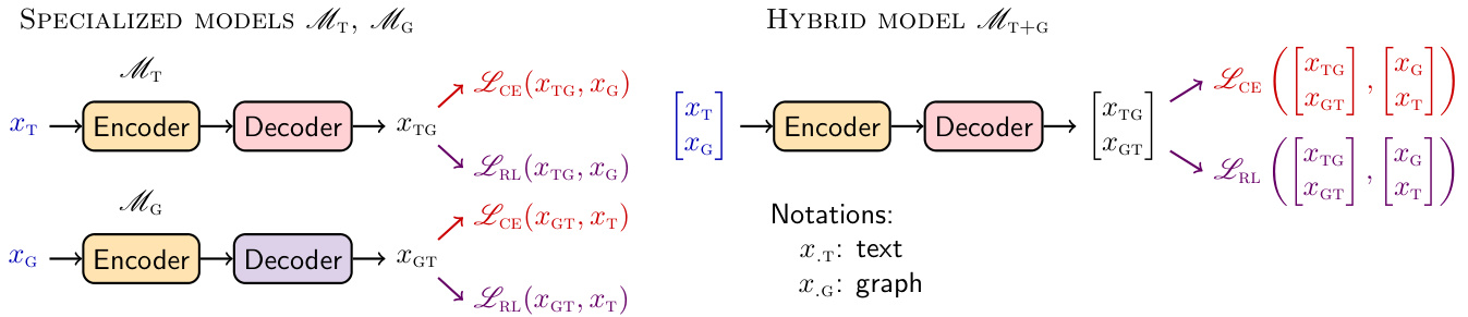 Figure 2: Specialized and hybrid models rely on the same losses for fine-tuning. However, specialized models are dedicated to a particular generation task while hybrid models can handle both generation directions.
