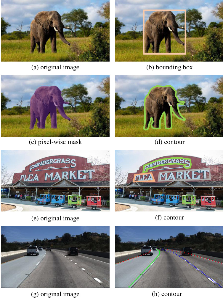 Fig. 1. An illustration of different representations to localize an instance within an image: (b) bounding box; (c) pixel-wise mask; and (d), (f), (h) contour. The images showcase three distinct task scenarios: general instance segmentation (a), scene text detection (f), and lane detection (h).