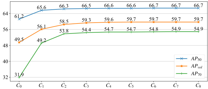 | 实验 | 方法 | APvol | AP50 | AP70 | 参数量 (M) FPS |