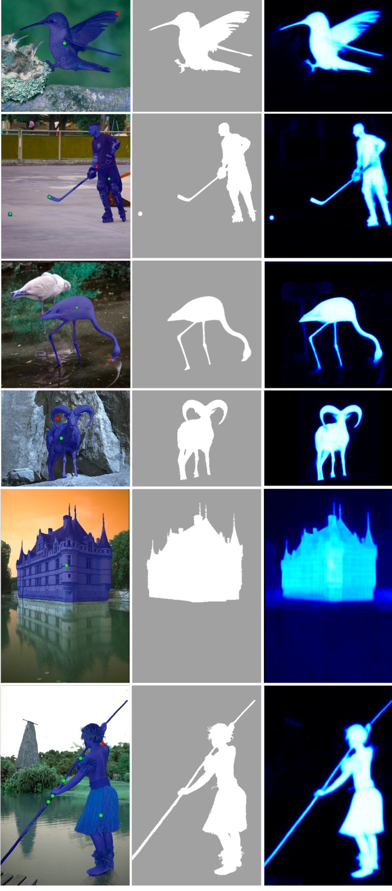 Figure 1: Examples of segmentation results that exceed an IoU of 0.95. The first column shows images with clicks (green for the foreground and red for the background) and segmentation masks from the proposed approach (blue). The second column shows the ground truth. The third column shows probability maps of the proposed approach. These raw images are from the Berkeley [18] and DAVIS [19] sets.