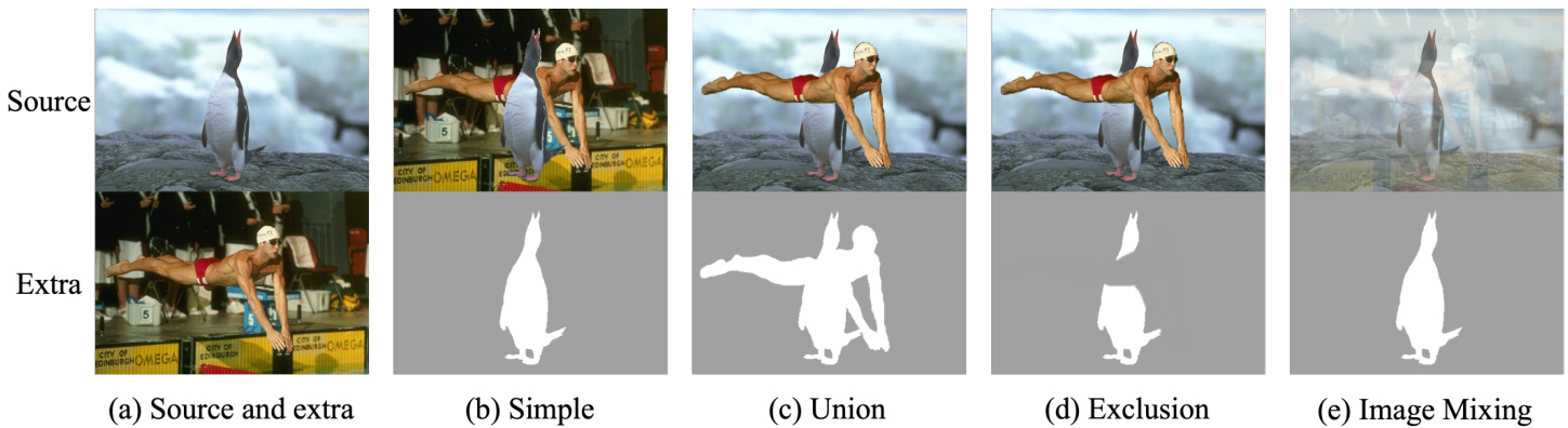 简单复制粘贴模式。该模式将源对象插入随机选择的额外图像中,并以源对象的掩码作为真实值。图4(b)直观展示了这种模式。