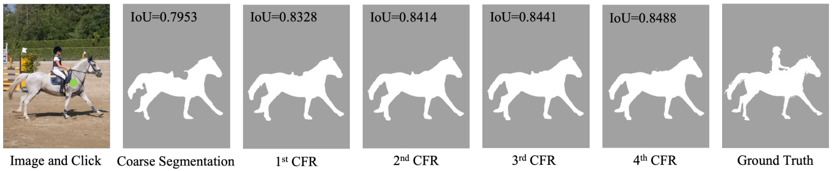 其中 $Y_{0}^{t}$ 表示第 $t$ 次粗分割步骤(外循环)的输出,$Y_{n}^{t-1}$ 是第 $t-1$ 步的最后一次精修掩码。公式5定义了内循环中第 $i$ 步的精修结果,$n$ 定义了精修步骤的数量,该数量可以设定为固定值或自适应确定。级联前向精修(CascadeForward Refinement)方法通过公式4和5迭代更新粗分割掩码和精修掩码。在精修过程(内循环)中不需要额外的用户点击,分割掩码会持续优化以提供更高质量的输入。图2展示了CFR的整体流程,图3显示了一系列CFR精修结果。