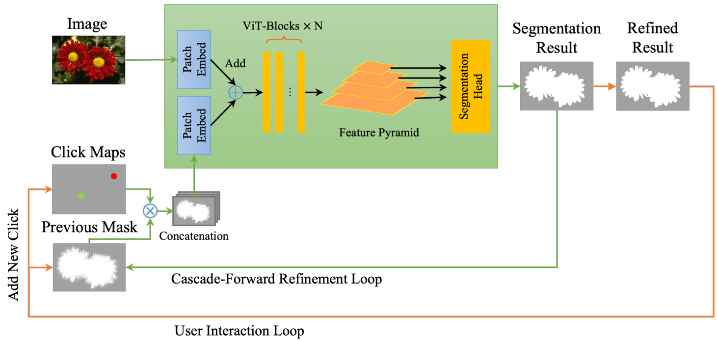 图 2: 集成级联前向优化(Cascade-Forward Refinement)的迭代掩码引导交互式分割流程概览。橙色线条表示用户交互循环(外循环),绿色线条表示优化循环(内循环),黑色线条为两个循环的共享流程。用户通过外循环添加新点击标注,在CFR循环中基于点击对前一掩码进行迭代优化。