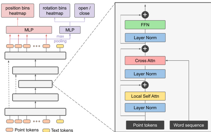 Language-conditioned point cloud transformer. We employ point cloud transformer v3 (PTV3) [49] as backbone to encode point cloud V . PTV3 adopts a U-Net [50] architecture with down sampling and upsampling blocks to efficiently compute point embeddings, where each block consists of transformer layers. For more details, please refer to the PTV3 paper [49]. We explore two variants to incorporate language information into the PTV3 model. Assuming the language instruction $L$ is encoded by a CLIP text encoder [39] and represented as a sequence of word embeddings $\left(w_{1},\cdots,w_{L}\right)$ . The first variant employs the adaptive normalization approach [51]. We compute a global language embedding $\overline{{w}}$ by weighted averaging $\left(w_{1},\cdots,w_{L}\right)$ , and use $\overline{{w}}$ to directly regress dimension-wise scale and shift parameters for each normalization layer in PTV3. The second variant utilizes a more conventional cross-attention mechanism [52]. A crossattention layer is added after each self-attention layer in PTV3, enabling each point to attend to the entire sequence of word embeddings $\left(w_{1},\cdots,w_{L}\right)$ .