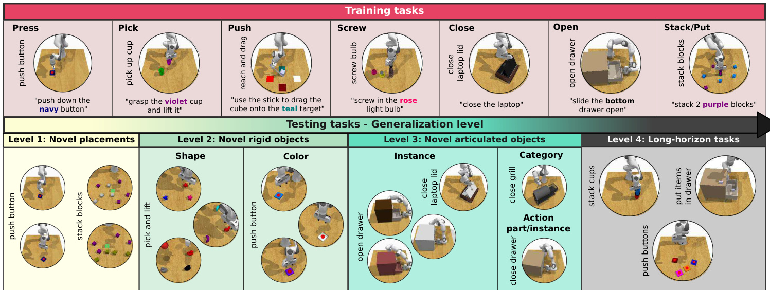 Level 3 - Novel articulated objects: This set includes 18 new tasks (21 variations) where the robot interacts with articulated objects. Three categories are proposed: 1) Novel action-part compositions. For example, if trained to open bottom drawer and put item in middle shelf, it now needs to open middle drawer. There are 8 novel compositions. 2) Novel instances. For example, after being trained on a threedrawer unit, it must generalize to one with four drawers. This set includes 11 new object instances. 3) Novel categories. For example, it is trained to close a laptop lid but must generalize to closing a grill lid. This includes 2 new object categories. Level 4 - Novel Long-horizon tasks: This level presents the greatest challenge as it requires the robot to combine multiple actions learned during training. It includes 6 long-horizon tasks (12 variations). For example, the task “put items in drawer” involves a sequence of actions such as opening the drawer, picking up a sequence of items (a cube, a cylinder and a moon), and placing them inside according to the order specified by the variation instruction.