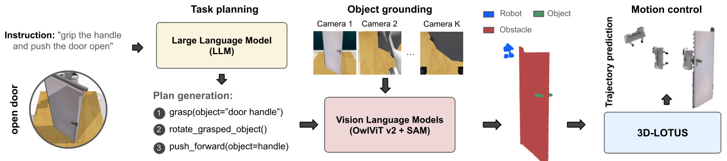 To accomplish a task specified by an instruction $L$ like ‘open the door’, the end-to-end policy 3D-LOTUS integrates multiple components into a single action prediction step. This includes task planning (e.g., first grasp the door handle), object grounding (e.g., localize the door handle in 3D space), and motion control (move to the localized door handle). This integration not only complicates error diagnosis, but also poses challenges in generalization to unseen scenarios, such as ‘open a new door’ or ‘close the door’.