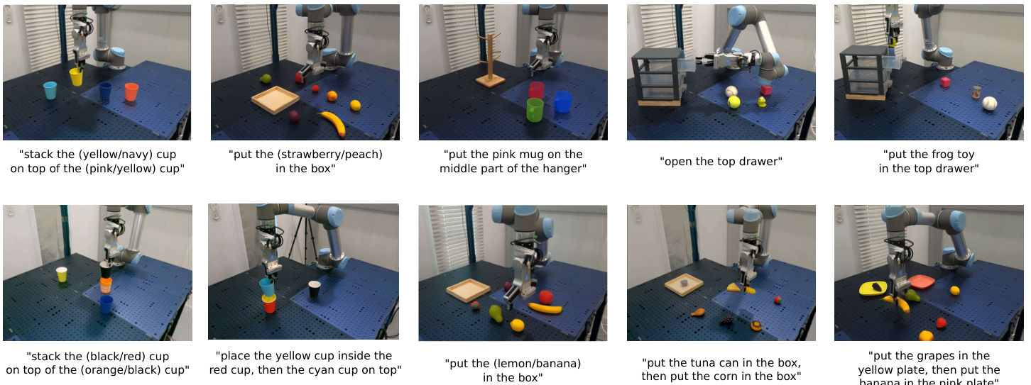 Experimental setup. Our real robot setup includes a 6- DoF UR5 robotic arm equipped with three RealSense d435 cameras. We consider 7 variations across 5 tasks during training: stack cup (yellow in pink or navy in yellow), put fruit (strawberry or peach) in box, open drawer, put item in drawer and hang mug. For each task variation, we collect 20 human demonstrations via tele-operation. Then, we evaluate on the same 7 seen task variations with different objects placements and evaluate generalization capabilities on 7 new unseen task variations: put fruit (lemon and banana) in box, put food (tuna can then corn) in box and put fruits in plates (grapes in the yellow plate and banana in the pink plate). These tasks are illustrated in Figure 4. For each task variation we run models 10 times and report the success rate.