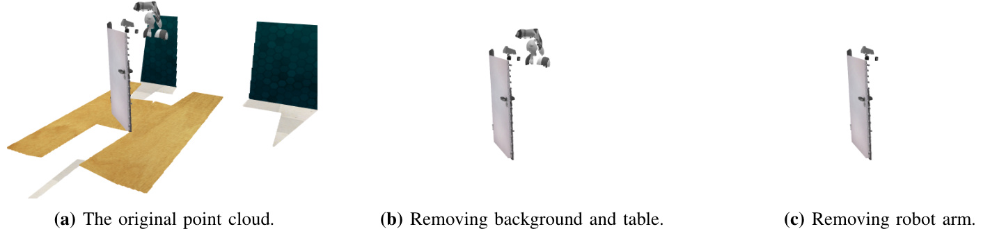 - Point cloud preprocessing: We automatically filter out irrelevant points from the point cloud during preprocessing. To remove background and table points, we define the robot’s workspace and the table height, excluding all points outside these boundaries. For the robotic arm, we assign 3D bounding boxes to each of its links. Using the robot’s proprio ce pti ve state, we transform these bounding boxes based on the known poses and remove any points within them. As a result, the remaining point cloud contains only objects and the robotic gripper. Figure 5 illustrates the point cloud before and after the point removal step.
