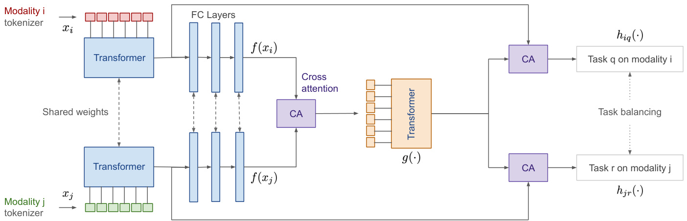 Figure 1. Overview of the proposed method. The proposed method consists of three parts, the feature transformation network   $f(\cdot)$   which consists of a transformer followed by fully connected layers to reduce feature dimensions, another transformer  $g(\cdot)$   and finally the task prediction heads  $h_{m t}(\cdot)$   for task  $t$   on modality  $m$  . The input data is tokenized with corresponding modality specific tokenizer. While training, pairs of modalities are used and the features are fused between the two modalities using cross attention layers, in a two stream configuration as shown here. While making prediction, the network is a single stream with cross attention layers removed, and the output is  $h_{m t}\circ g\circ f(x)$   where  $_x$   is the output of the corresponding modality specific tokenizer.