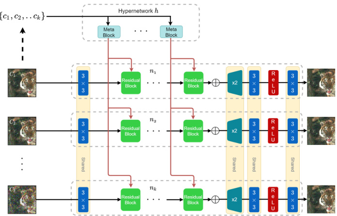 在本工作中,我们提出了一种方法,使标准单一恢复模型无需增加额外参数即可在多种退化级别上实现极高精度。我们引入了一个超网络(hyper network),该网络能根据输入的修复级别参数,有条件地生成图像修复网络的滤波器权重。训练过程中,我们的超网络与多个主网络协同优化,可同时处理不同退化程度的图像修复任务。基于输入退化级别,该超网络能在运行时生成具有最精准滤波器权重的单一网络。