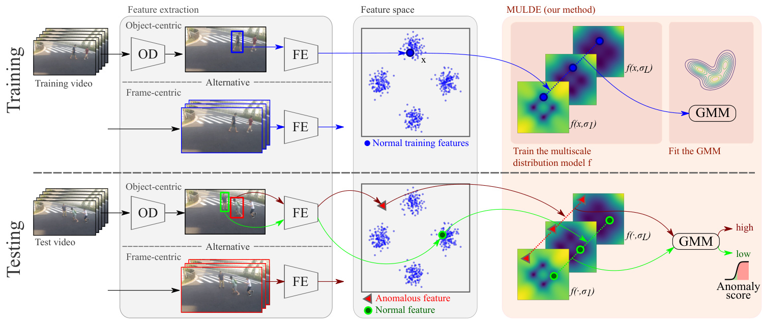 Figure 1. MULDE approximates the negative log-density of noisy, normal video features at multiple levels of noise  $\sigma$   with a neural network  $f(\cdot,\sigma)$  . The log-likelihoods estimated at multiple noise levels are combined into a single anomaly score with a Gaussian mixture model (GMM). MULDE can be trained to detect video anomalies in an object-centric or frame-centric manner. In the object-centric approach, an object detector (OD) is used to detect objects which are then fed to the feature extractor (FE). In the frame-centric approach, the feature extractor is applied to short sequences of entire frames.