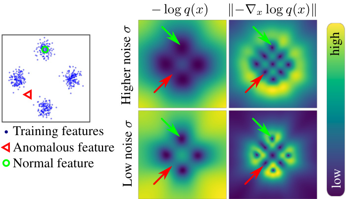 其中 $\rho(\ensuremath{\widetilde{\mathbf{x}}}|\ensuremath{\mathbf{x}})$ 表示给定无噪声样本 $\mathbf{x}$ 时噪声样本 $\tilde{\bf x}$ 的条件分布,我们假设其为以 $\mathbf{x}$ 为中心的独立同分布高斯分布。我们异常检测器的核心思想是 $q$ 保留了 $p$ 的形态,但与之不同的是,它可以通过神经网络进行近似。具体来说,我们近似负对数密度函数 $-\log q(\tilde{\mathbf{x}})$(相差一个常数),由于其与 $q(\tilde{\mathbf{x}})$ 的双射关系,这是一个极佳的异常指标。$-\log q(\tilde{\mathbf{x}})$ 的低值对应于高概率密度,是正常数据的特征;其高值则表明低概率密度区域,可能是异常数据所在之处。图 2 在一个合成示例中展示了这一点。我们用于通过神经网络近似对数密度的技术是对分数匹配 [41](一种近似对数密度梯度的方法)的改进。