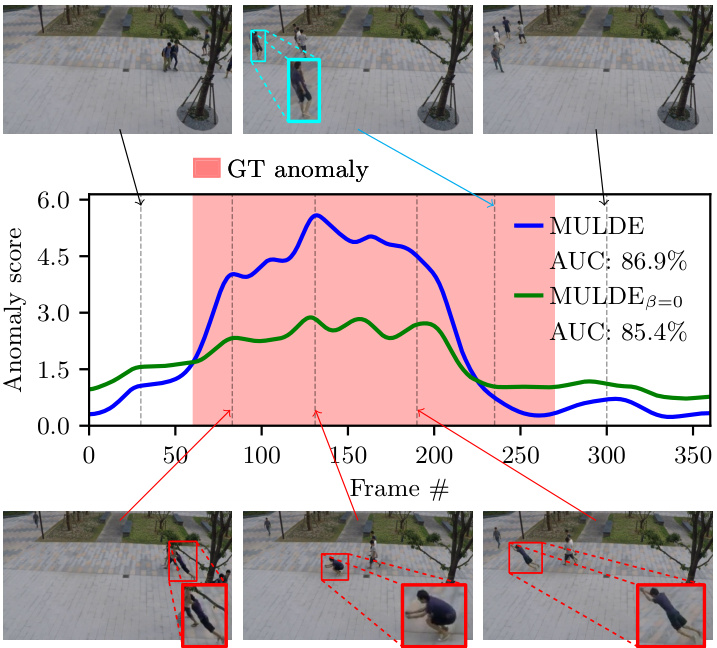 Performance in frame-centric VAD As can be seen in Table 2, in frame-centric VAD, MULDE outperforms other methods on all three data sets. Notably, on the UCFCrime data set, by far the largest publicly available VAD benchmark, we advance the state of the art in terms of the micro score by 3.8 percent points. We improve the state of the art by more than 2pp on Shanghai Tech and UBnormal.