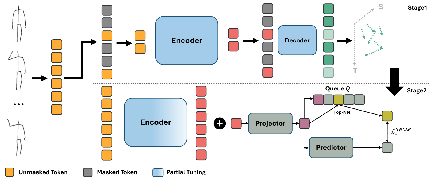 The overall framework of STARS is illustrated in Fig. 2. It is a sequential self-supervised approach consisting of two main stages. The first stage relies on an MAE-like framework to pretrain the weights of the encoder. We use MAMP [28] because it shows promising result in 3D ac- tion representation learning; however, any alternative MAEbased approach is also applicable. The next stage is designed to tune the parameters of the encoder using an instance discrimination method. Specifically, the second stage replaces the decoder with a projector and predictor [15]. It trains them in addition to the encoder using Nearest-Neighbor Contrastive Learning (NNCLR) [12] to converge to a representation capable of discriminating different sequences. This approach helps the encoder learn to output distinct clusters for different actions, improving its ability to discriminate between various sequences.