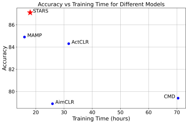 Despite the significant efforts that have been made, how to learn a more disc rim i native representation of skeletons is still an issue for skeleton-based action recognition. We believe that integrating MAE-based approaches with contrastive-learning methods can enhance the genera liza bility of representations, while preserving the strong performance of MAE models in within-dataset evaluations. To this end, we propose Self-supervised Tuning for 3D Action Recognition in Skeleton Sequences (STARS), a simple and efficient self-supervised framework for 3D action representation learning. It is a sequential approach that initially uses MAE as the pretext task. In the subsequent stage, it trains a contrastive head in addition to partially tuning the encoder for a few epochs, motivating the representation to form distinct and well-separated clusters. Fig. 1 shows that STARS requires significantly less resources during pretraining compared to contrastive learning approaches. In addition, STARS outperforms both MAE and contrastive learning approaches. In summary, our main contributions are as follows: