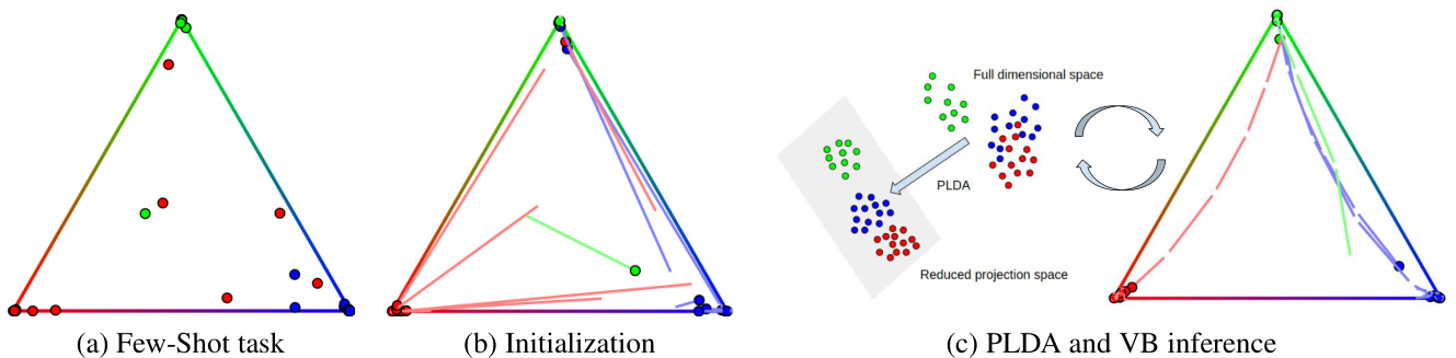 Figure 1: Summary of the proposed method. Here we illustrate a 3-way classification task in a standard 2-simplex using soft-classification probabilities. Trajectories show the evolution across iterations. For a given Few-Shot task which nearest-class-mean probabilities are depicted in (a), a Soft-KMEANS clustering method is performed in (b) to initialize  $O_{n k}$   (see Alg. 1). Then in (c) an iterative ly refined Variation al Bayesian (VB) model with Adaptive Dimension Reduction using Probabilistic Linear Discriminant Analysis (PLDA) is applied to obtain the final class predictions.