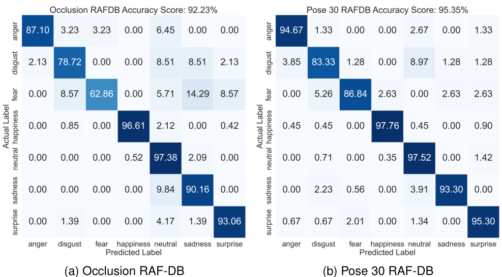 Whereas the purpose of integrating a patch attention mechanism is often to highlight significant local facial regions and hence improve the classification performance under challenging conditions, the confusion matrices depicted in Fig. 2 - 5 have shown that the patch attention is identical to the patch extraction in terms of performance under challenging conditions. Specifically, the classification accuracy and perclass performance under challenging conditions are similar between these two designs. Both performed similarly well overall and in most classes except the Contempt class and the Disgust class, where both struggled to perform well.