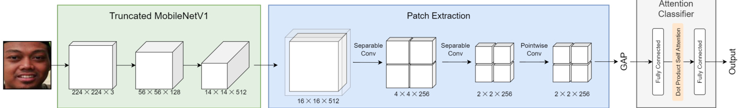 Our proposed patch extraction block consists of three different convolutional layers, the first two being depthwise separable convolutional layers and the last being a pointwise convolutional layer. Operating on feature maps from the Mobile Ne tV 1 that are padded to the dimension of $16\times16$ , the first separable convolutional layer is responsible for splitting the feature maps into four patches while learning higher-level features from its input. Subsequently, the second separable convolutional layer and the pointwise convolutional layer are responsible for learning the higher-level features from the patched feature maps, resulting in output with a dimension of $2\times2$ . Instead of the standard convolutional layer used in conventional CNNs, the depthwise separable convolutional layer is selected for PAtt-Lite. This design decision improves the classification performance of the proposed method on challenging subsets while reducing the number of model parameters.