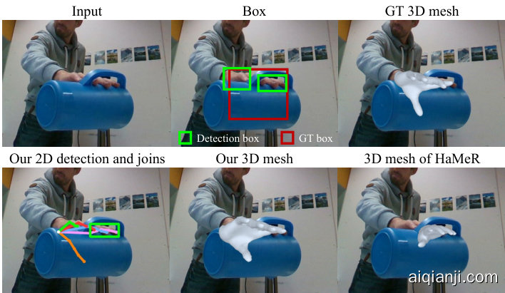 HO3Dv3。对于物体操控场景,我们的方法也展现出卓越性能,如表 3 所示。但我们认为先前研究对 HO3Dv3 数据集的完美检测假设并不合理。如图 5 所示,对于高度遮挡的样本,仅能检测到手部局部区域 (即绿色框),而真实标注框仍提供包含遮挡区域的完整手部边界 (即红色框)。因此,先前工作报告的结果未能准确反映实际应用中的性能表现。