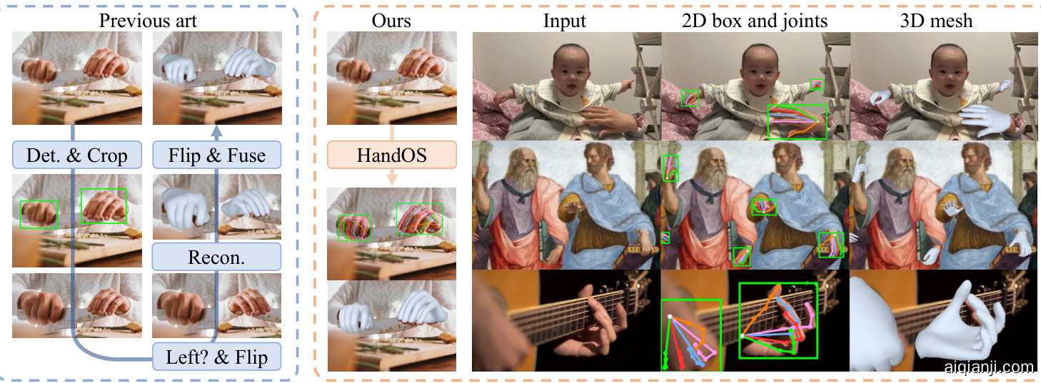 现有手部重建方法主要遵循多阶段框架,包括检测、左右手分类和姿态估计。这种范式会导致冗余计算和误差累积。本文提出HandOS——一个端到端的三维手部重建框架。我们的核心思路是以冻结检测器为基础,融入辅助模块进行2D和3D关键点估计。通过这种方式,我们将姿态估计能力整合到检测框架中,同时消除了左右手分类作为先决条件的必要性。具体而言,我们提出交互式2D-3D解码器:2D关节语义来自检测线索,3D表征则从2D关节提升而来。此外,设计了分层注意力机制来同步建模2D关节、3D顶点和相机位移。最终在单阶段框架内实现了手部检测、2D姿态估计和3D网格重建的端到端集成,从而克服了上述多阶段缺陷。HandOS在公开基准测试中达到最先进性能,例如FreiHand数据集上5.0的PA-MPJPE,HInt-Ego4D数据集上64.6%的PCK@0.05。