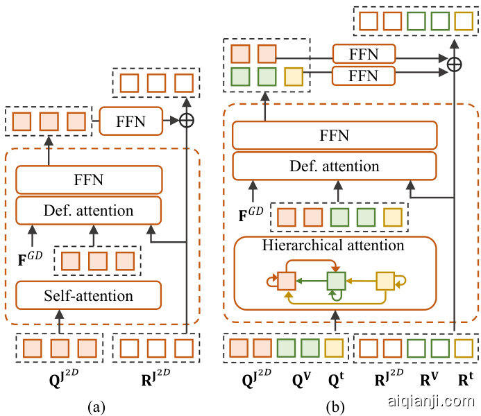 图 3: 解码层。(a) 经典2D层,被先前工作广泛采用。(b) 交互层,其中设计了分层注意力机制以有效建模2D和3D查询。
