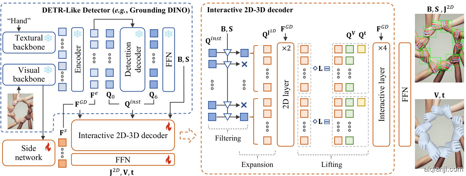 其次,我们采用统一的关键点表示方式(即2D关节和3D顶点)来处理左右手,而非MANO参数。由于手部通常在整幅图像中占据较小区域,因此我们设计了一种实例到关节的查询扩展机制,在检测结果引导下从全图中提取2D关节的语义信息。随之而来的问题是——如何利用2D线索推导3D语义并实现2D-3D信息交互?为此,我们提出2D到3D查询提升机制,将2D查询转换到3D空间。此外,考虑到2D与3D元素的不同特性,我们提出分层注意力机制以实现跨2D与3D领域的高效训练。最终构建的交互式2D-3D解码器能够同步建模2D关节、3D顶点和相机位移。