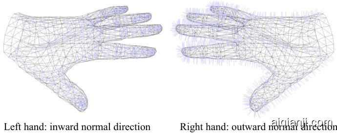 HandOS 既不需要以左右类别作为前提,也没有明确包含左右分类模块。然而,左右信息已经嵌入到重建的网格中。具体来说,我们使用法向量作为指示器。如图 4 所示,基于右手表面,如果网格属于左手,法向量指向几何内部;否则指向几何外部。通过这种方式即可获得左右类别。