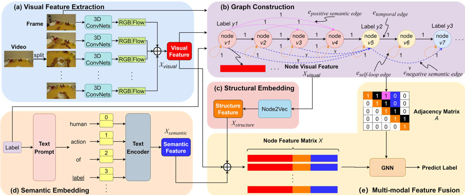 Fig. 1 Overview of the pipeline for Semantic 2 Graph. (a) Extracting visual features from video frames. (b) An instance of a videobased graph. (c) Encoding node neighborhood information as structural features. (d) Encoding the label text to obtain semantic features. (e) A GNNs is trained to fusion multi-modal features to predict node labels.