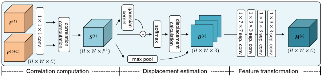 Correlation computation. Let us denote the two adjacent input feature maps by $\mathbf{F}^{(t)}$ and $\mathbf{\deltaF}^{(t+1)}$ , each of which is 3D tensors of size $H\times W\times C$ . The spatial resolution is $H\times W$ and the $C$ dimensional features on spatial position $\mathbf{x}$ by $\mathbf{F_{x}}$ . A correlation score of position $\mathbf{x}$ with respect to displacement $\mathbf{p}$ is defined as