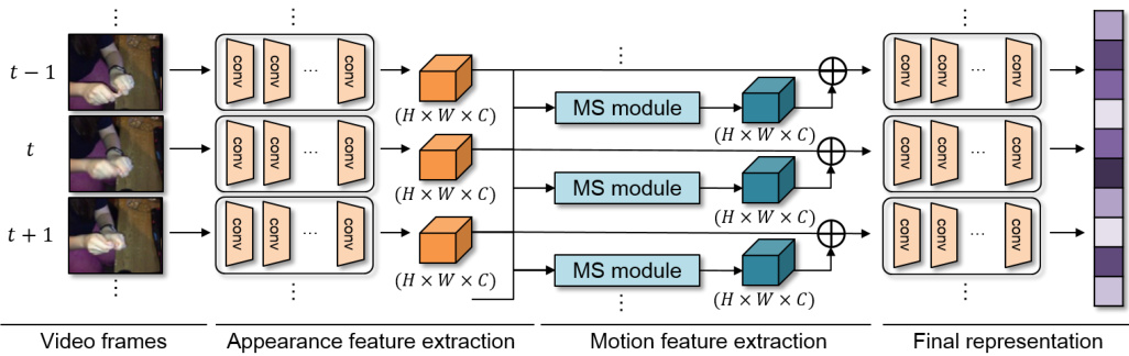Fig. 2: Overall architecture of the proposed approach. The model first takes   $T$  video frames as input and converts them into frame-wise appearance features using convolutional layers. The proposed Motion Squeeze (MS) module generates motion features using the frame-wise appearance features, and combines the motion features into the next downstream layer.  $\bigoplus$  denotes element-wise addition.