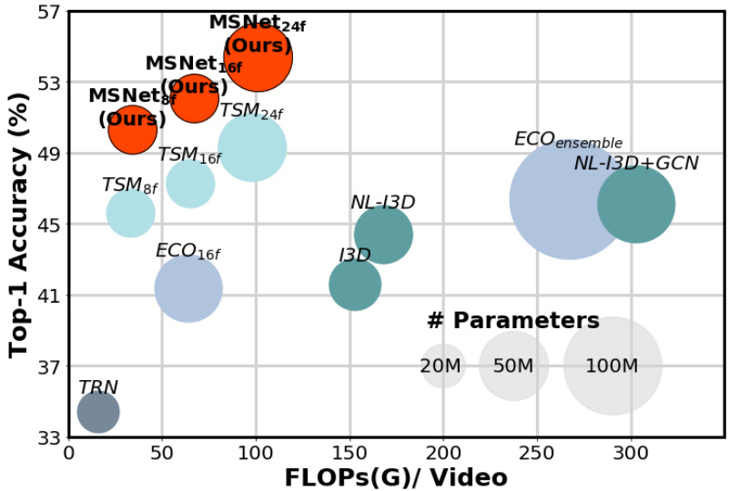 Table 1 summarizes the results on Something-Something V1&V2. Each section of the table contains results of 2D CNN methods [20, 22, 40, 47], 3D CNN methods [16, 23, 42, 43, 48], ResNet with TSM (TSM ResNet) [21], and the proposed method, respectively. Most of the results are copied from the corresponding papers, except for TSM ResNet; we evaluate the official pre-trained model of TSM ResNet using a single center-cropped clip per video in terms of top-1 and top-5 accuracies. Our method, which uses TSM ResNet as a backbone, achieves $50.9%$ and $63.0%$ on Something-Something V1 and V2 at top-1 accuracy, respectively, which outperforms most of 2D CNN and 3D CNN methods, while using a single clip with 8 input frames only. Compared to the TSM ResNet baseline, our method obtains a significant gain of about 5.3% points and 4.2% points at top-1 accuracy at the cost of only $2.5%$ and $1.2%$ increase in FLOPs and parameters, respectively. When using 16 frames, our method further improves achieving $52.1%$ and $64.7%$ at top-1 accuracy, respectively. Following the evaluation procedure of two-stream networks, we evaluate the ensemble model (MSNet-R50 $_{E n}$ ) by averaging prediction scores of the 8-frame and 16-frame models. With the same number of clips for evaluation, it achieves top-1 accuracy 1.8% points and $1.6%$ points higher than TSM two-stream networks with 22% less computation, even no optical flow needed. Our 10-clip model achieves $55.1%$ and $67.1%$ at top-1 accuracy on Something-Something V1 and V2, respectively, which is the state-of-the-art on both of the datasets. As shown in Figure 1, our model provides the best trade-off in terms of accuracy, FLOPs, and the number of parameters.