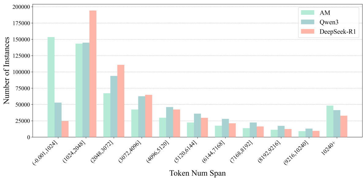 Further, Figure 3 presents the token span distribution specifically for math instances. It demonstrates that AM-Thinking-v1’s math data exhibits a highly dispersed distribution—many short sequences (under 1024 tokens) and a substantial portion of very long sequences ( $10240+$ tokens). This reflects the token distribution characteristics under a fixed query set, where AM-Thinking-v1 tends to produce both short and very long responses more frequently. In contrast, Qwen3-235B-A22B’s data generally exhibits longer token spans, indicating a tendency toward producing longer responses. DeepSeekR1’s token spans are mostly concentrated between 1k and $8\mathrm{k\Omega}$ tokens, showing a moderate range of response lengths.