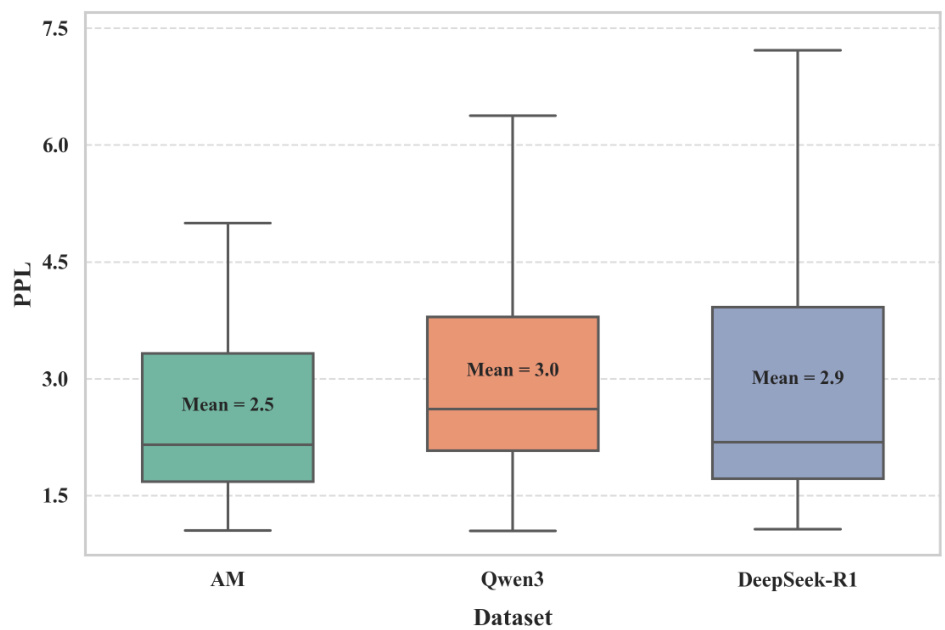 Finally, Figure 5 compares the perplexity (PPL) across the datasets. Perplexity is a key measure of language model performance, with lower values indicating better quality. Among the three datasets, AM-Thinking-v1 achieves the lowest mean PPL (2.5), suggesting that its distilled outputs are generally of higher quality. DeepSeek-R1 (mean $\mathrm{PPL}=2.9\$ ) performs slightly better than Qwen3 (mean $\mathrm{PPL}=3.0\AA$ ), highlighting the relatively strong performance of AM-distilled data in terms of perplexity.
