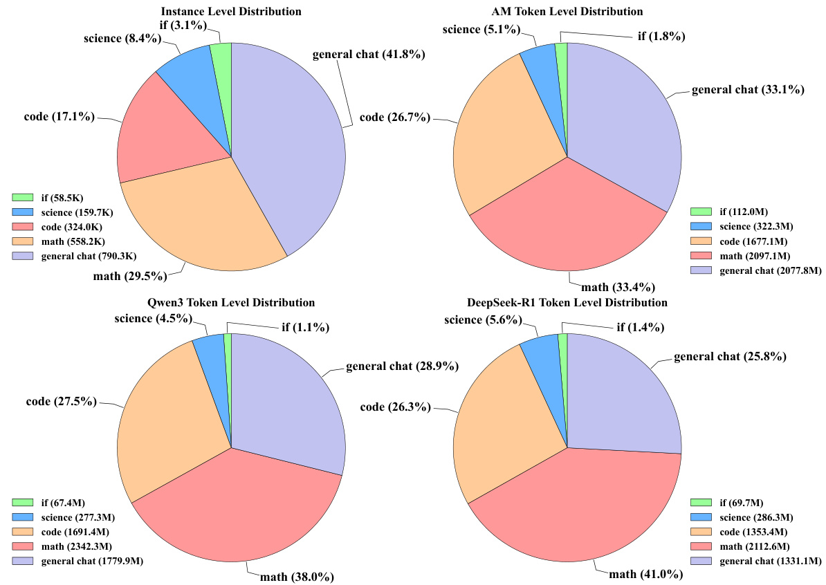 Figure 2 shows the output distribution of these datasets at both the instance and token levels. The instance-level distribution (top-left) reveals that this dataset includes a high proportion of general chat $(41.8%)$ , followed by math $(29.5%)$ and code $(17.1%)$ . In contrast, Qwen3-235B-A22B and DeepSeek-R1 token-level distributions (bottom charts) show a more pronounced focus on math $38.0%$ and $41.0%$ respectively), with general chat and code sharing similar proportions. Notably, AM-Thinking-v1’s token-level distribution (top-right) also emphasizes math $(33.4%)$ , albeit to a lesser extent than DeepSeek-R1. Science and instruction-following (IF) data make up a minor share across all datasets.