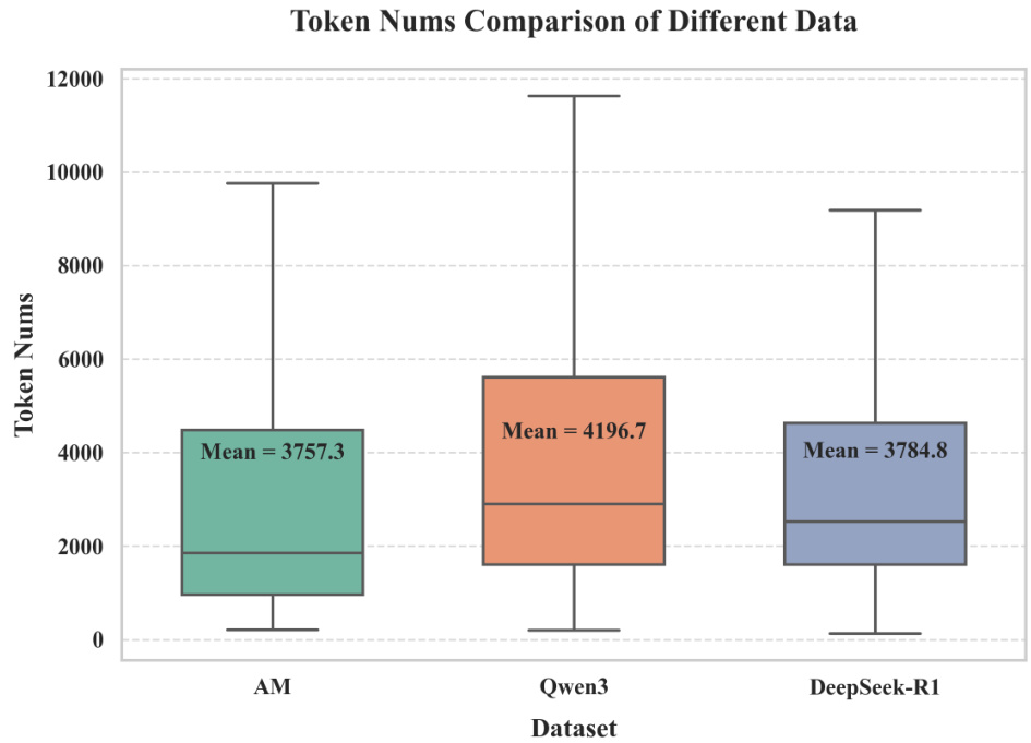 Box plots in Figure 4 provide further insight into the average token length per instance. The Qwen3- 235B-A22B dataset has the highest mean token count (4196.7), followed by DeepSeek-R1 (3784.8) and AM-Thinking-v1 (3757.3). This aligns with the histogram observation that Qwen3-235B-A22B emphasizes longer instances, whereas AM-Thinking-v1 covers a broader range of lengths, including extremely short and long sequences.