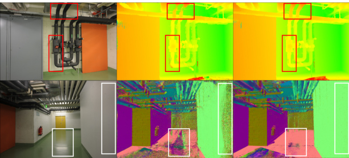 Figure 2: Top: depth maps for scenes crossing object boundaries. Bottom: normal maps for limited perception range. Comparison of APD-MVS (middle) and our method (right).