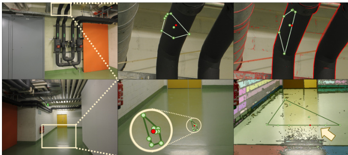 图 3: APDMVS (中) 与我们方法 (右) 的平面构建对比,包含细边缘 (右上) 和粗边缘 (右下) 的可视化效果。