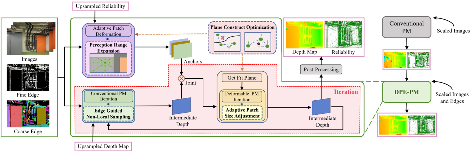 In DPE-PM, the first stage is to obtain anchors for each unreliable pixel. In adaptive patch deformation, we propose Perception Range Expansion to search for a wide range of relevant reliable pixels and use RANSAC to filter out the anchors. The second stage is to iterative ly update the depth map. In each iteration, the hypotheses for reliable pixels are first updated using conventional PM with our Edge Guided Non-Local Sampling. Subsequently, the hypotheses for unreliable pixels are updated: new plane hypothesis are generated using RANSAC based on the anchors, followed by deformable PM with our Adaptive Patch Size Adjustment. In the previously mentioned RANSAC applications, our Plane Construction Optimization was consistently utilized to obtain accurate plane models. Similarly, post-processing is used to determine pixel reliability after obtaining the depth map. The DPE-PM process is repeated at finer scales until the depth map for the first layer is obtained. Finally, the depth maps are fused to generate a point cloud.