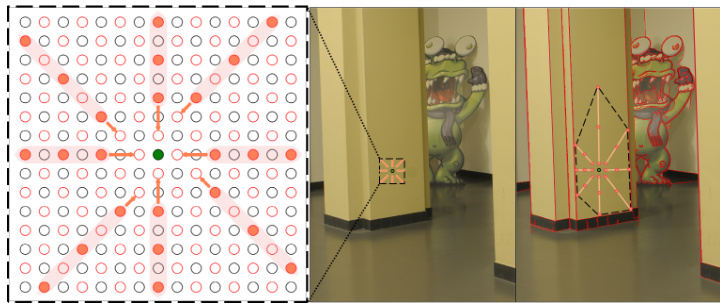 Figure 5: Edge Guided Non-Local Sampling: This process includes two sampling schemes: progressive non-local sampling (left) and edge-guided extended sampling (right).